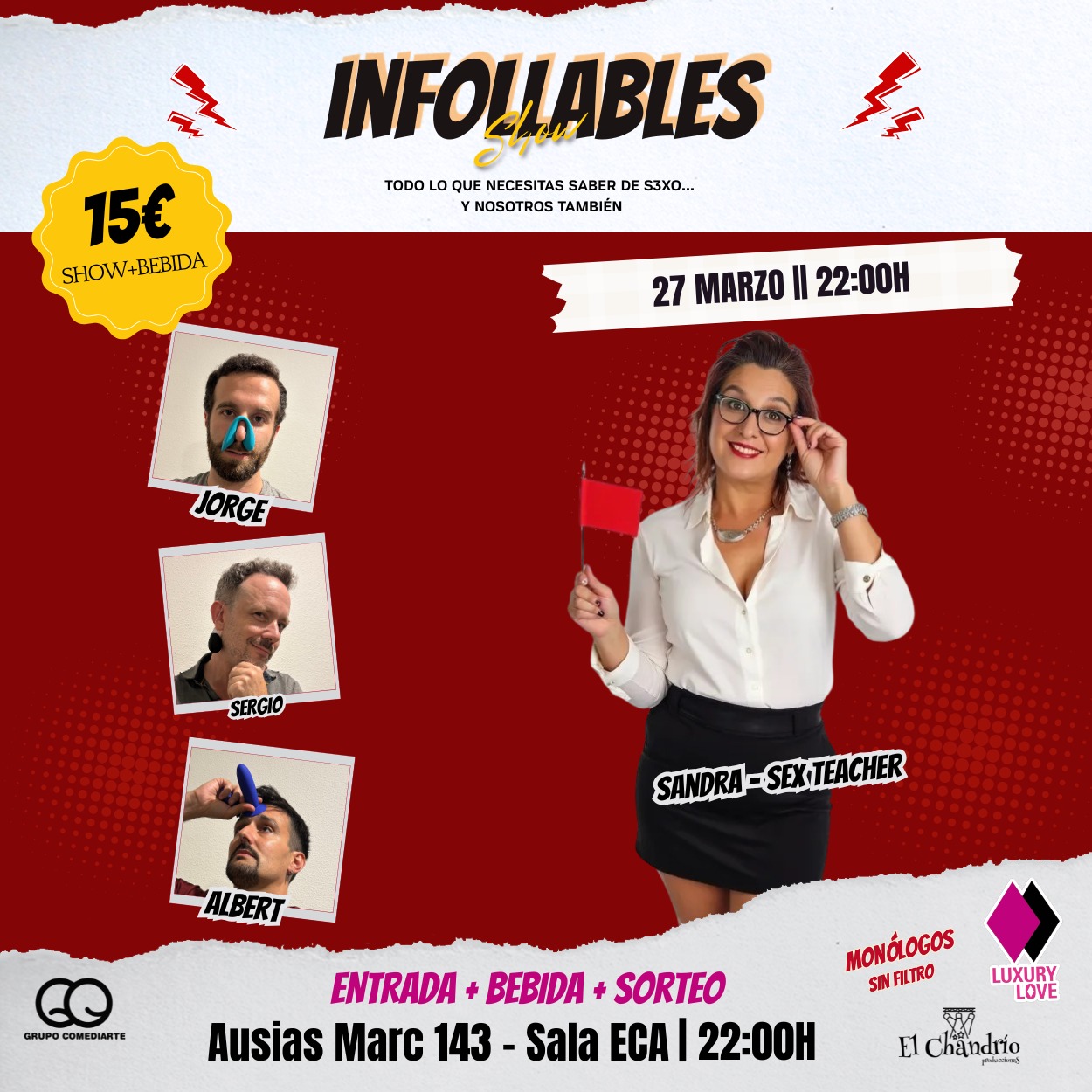 ¡Infollables – Monólogos e Impro! ¡Prepárate para un show que convierte los errores en risas y añade un toque de terapia! Únete a un valiente grupo de comediantes (y un poco traumatizados) que subirán al